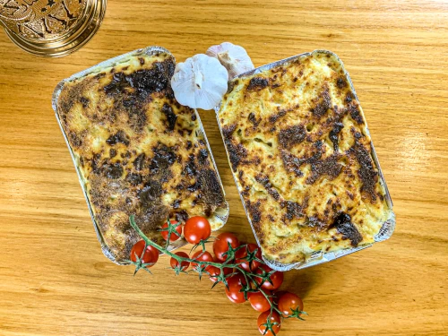 Baked penne pasta with spiced beef mince and creamy bechamel sauce