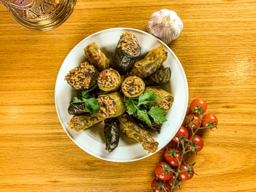 A delicious platter of rice-stuffed vine leaves, cabbage, zucchini & eggplant.